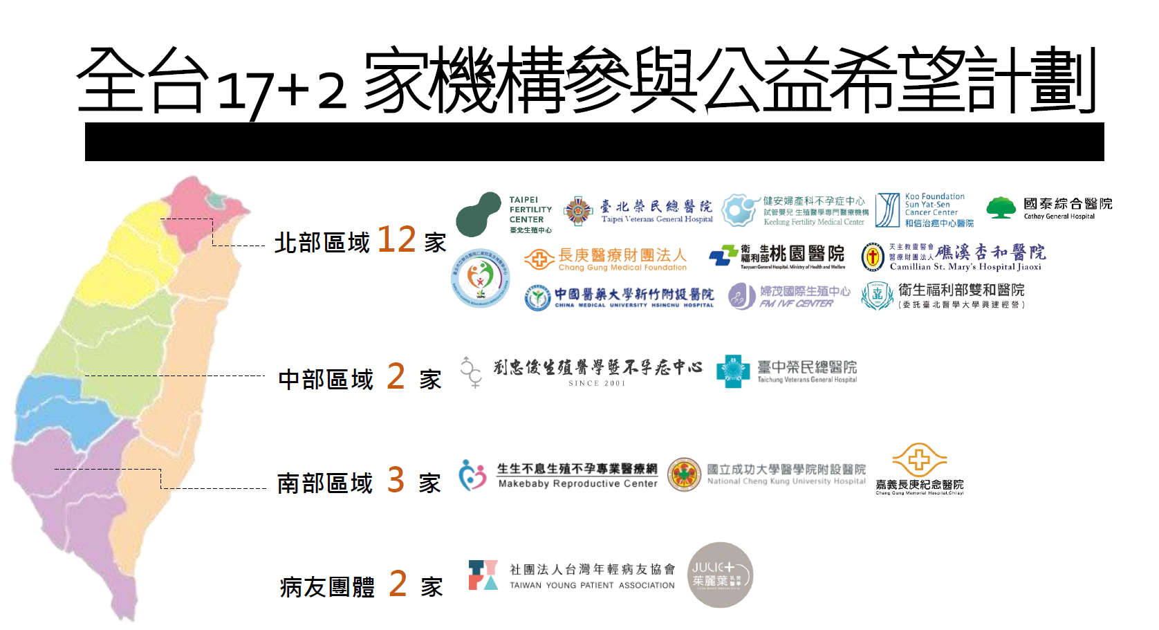 為了讓癌症病友在治療前,能更即時、就近地取得生育保存相關諮詢與醫療資源,TEFA 台灣凍卵協會持續邀請全台生殖醫療院所與病友支持機構成為合作聯盟,目前已與 全台 17+2 家醫療院所及病友團體 共同參與「公益希望計畫」,攜手提供病友更完整的支持網絡。
