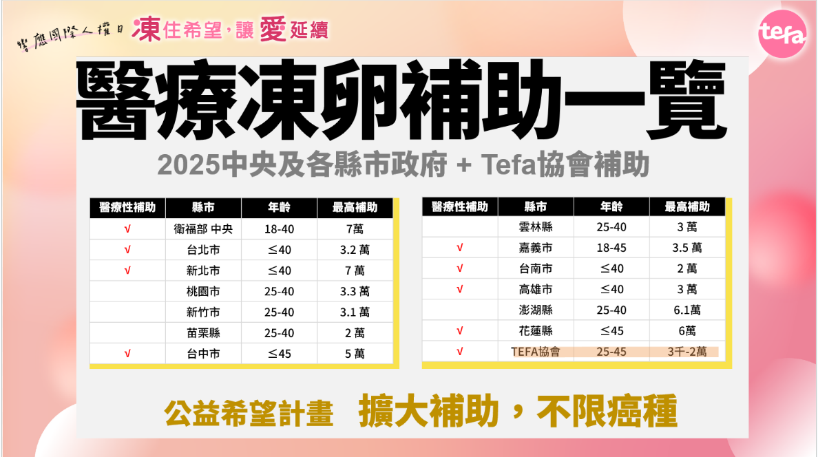 ▲中央以及各縣市政府+TEFA 凍卵協會醫療性凍卵補助表