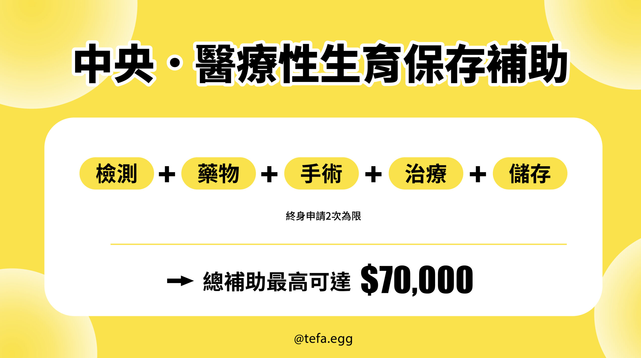 即使已經獲得政府凍卵補助,仍可以透過TEFA公益計畫獲得更多支持,台灣凍卵協會(TEFA)推動的 「公益希望計畫」,專門為女性癌症患者提供醫療性凍卵補助,幫助減輕經濟負擔。