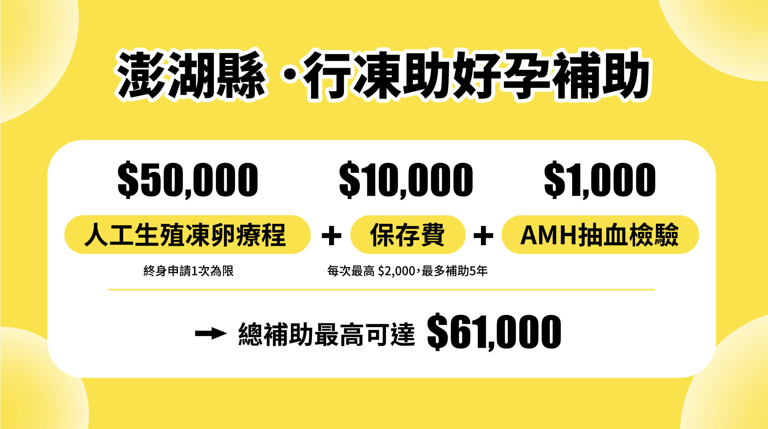 (四)凍卵療程費用:於本計畫期程內至衛生福利部許可之全國人工生殖機構完成凍卵流程。每案補助新臺幣(以下同)50,000元,限終身補助1次。