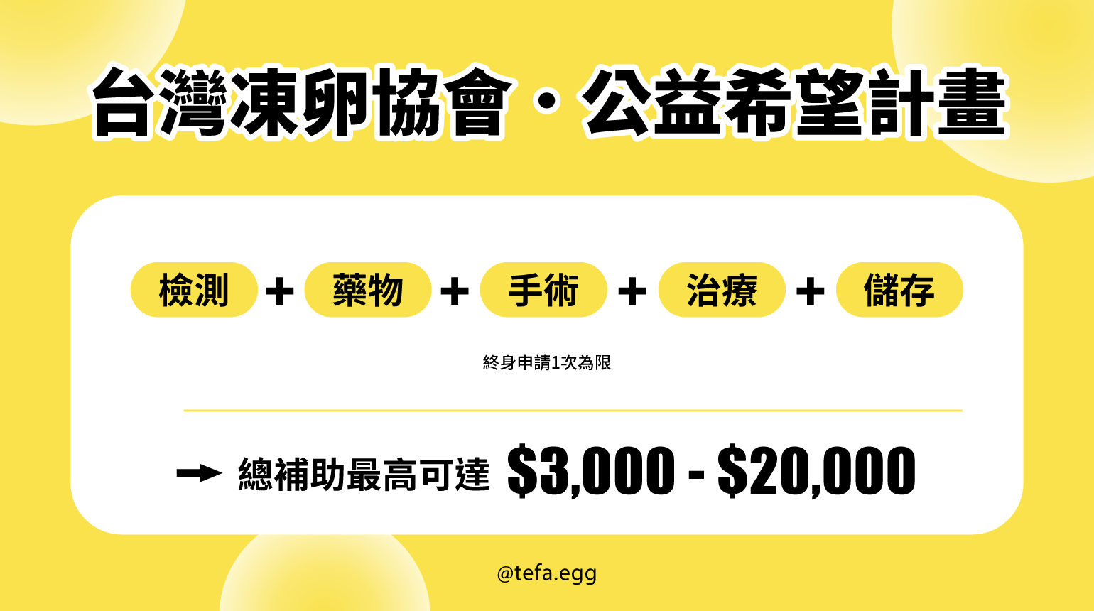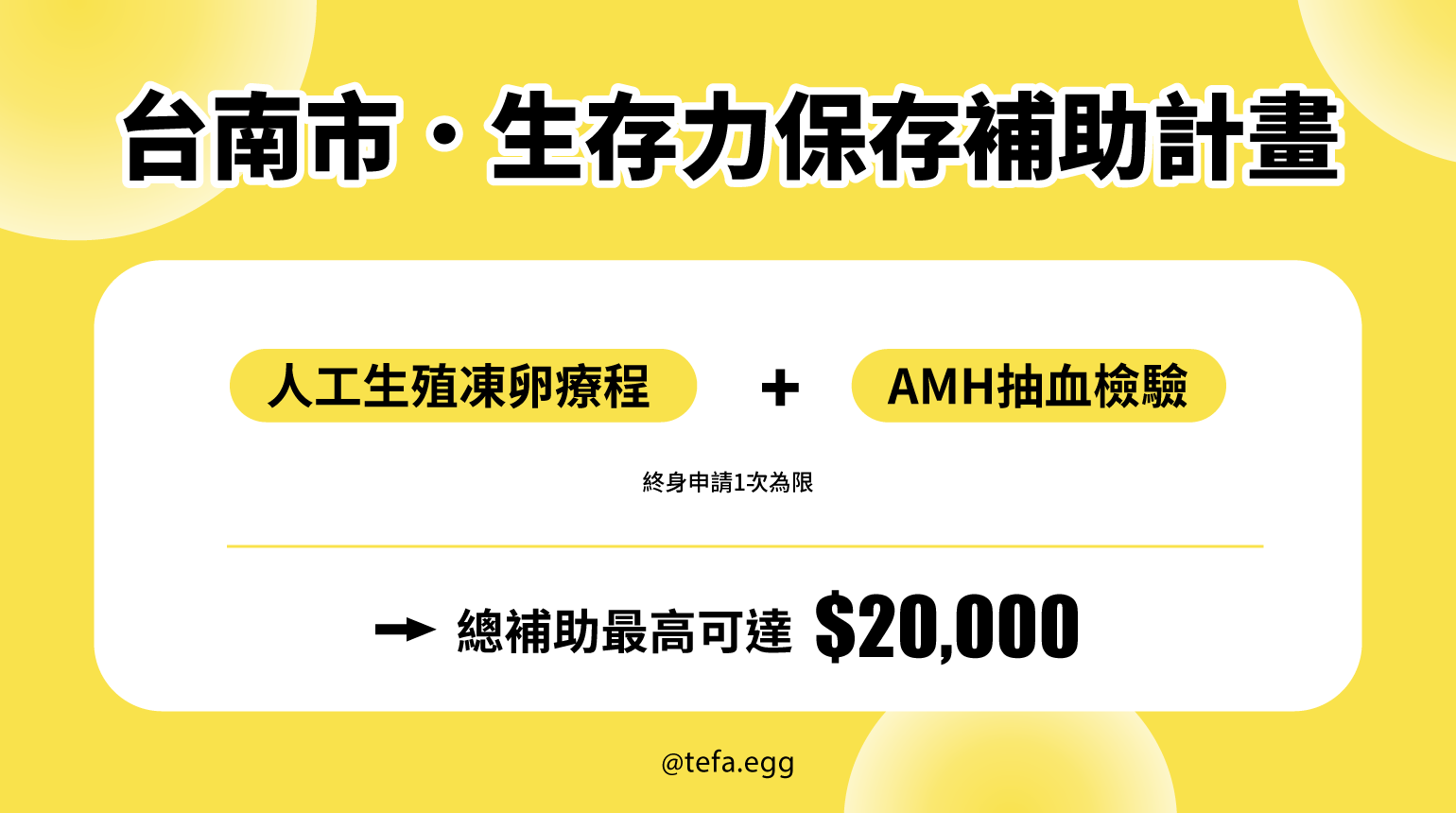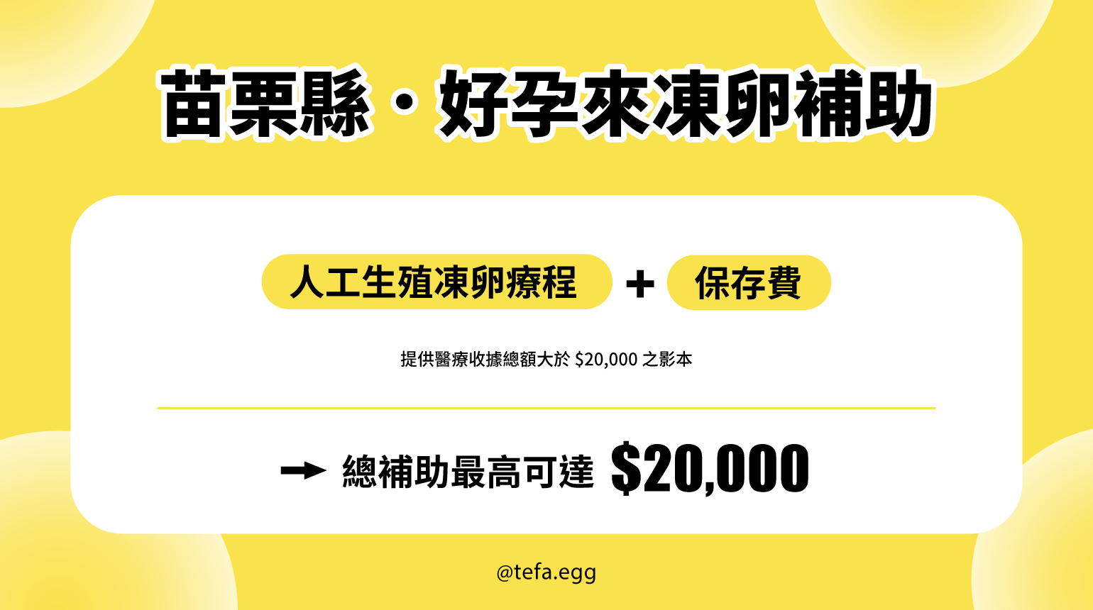 【凍卵療程】終身補助 1次,最高20,000元。
