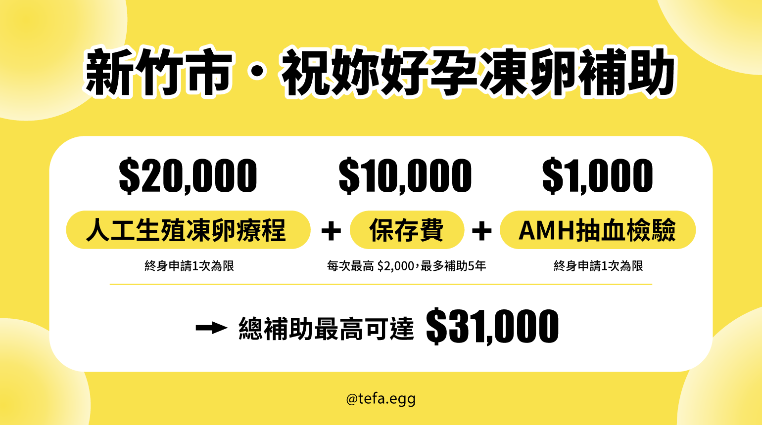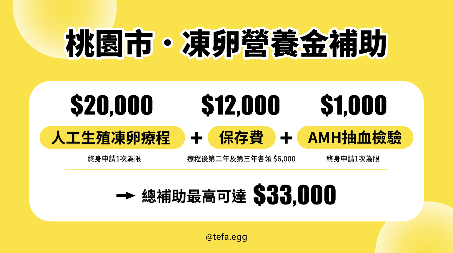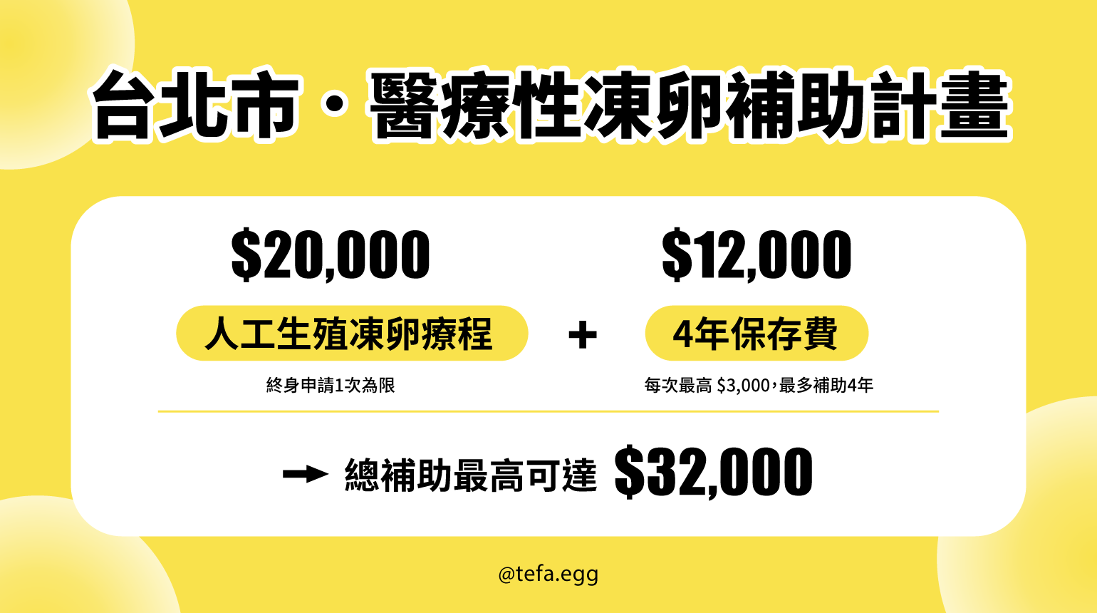 【凍卵療程】終身補助 1次,最高20,000元。